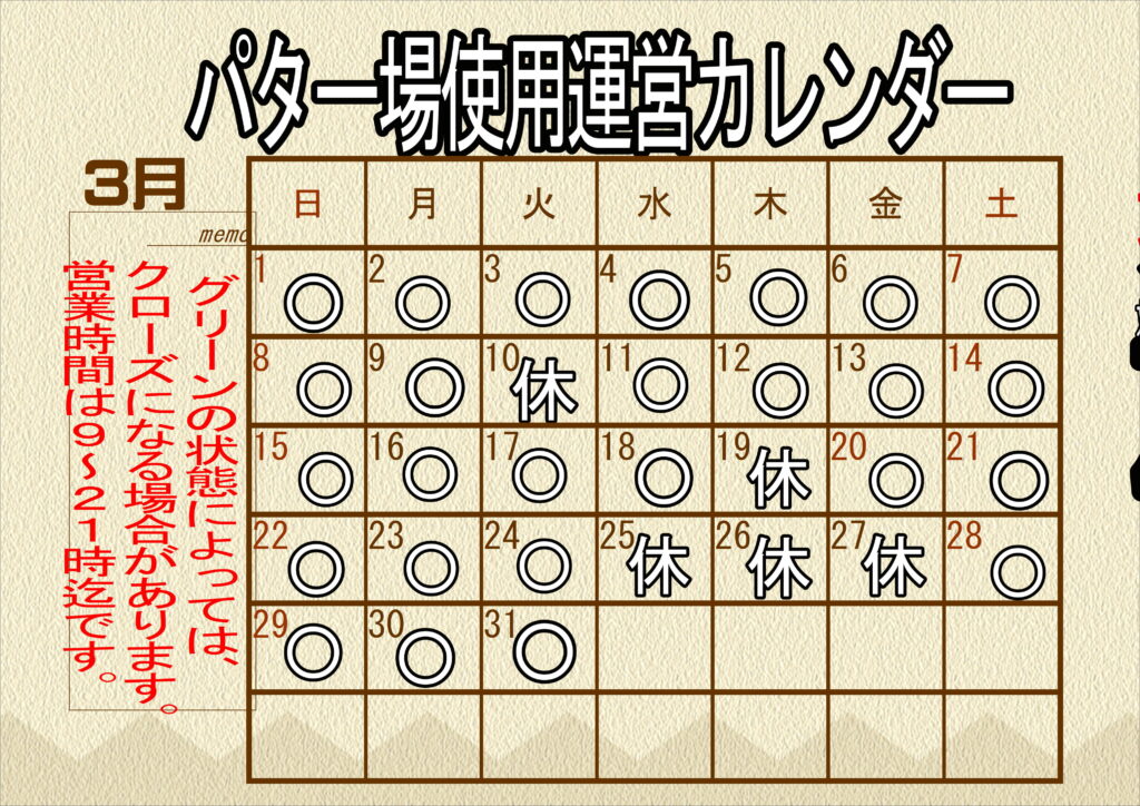 ※グリーンの状態によっては、カレンダー通りにならない場合もあります。ご了承ください。