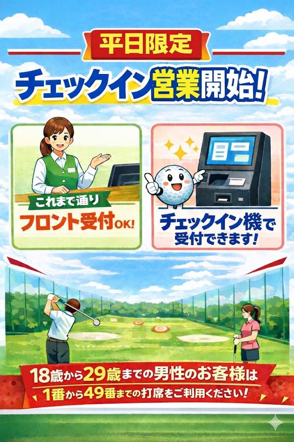 みのるゴルフ妹尾では、平日限定でチェックイン営業を開始しました。