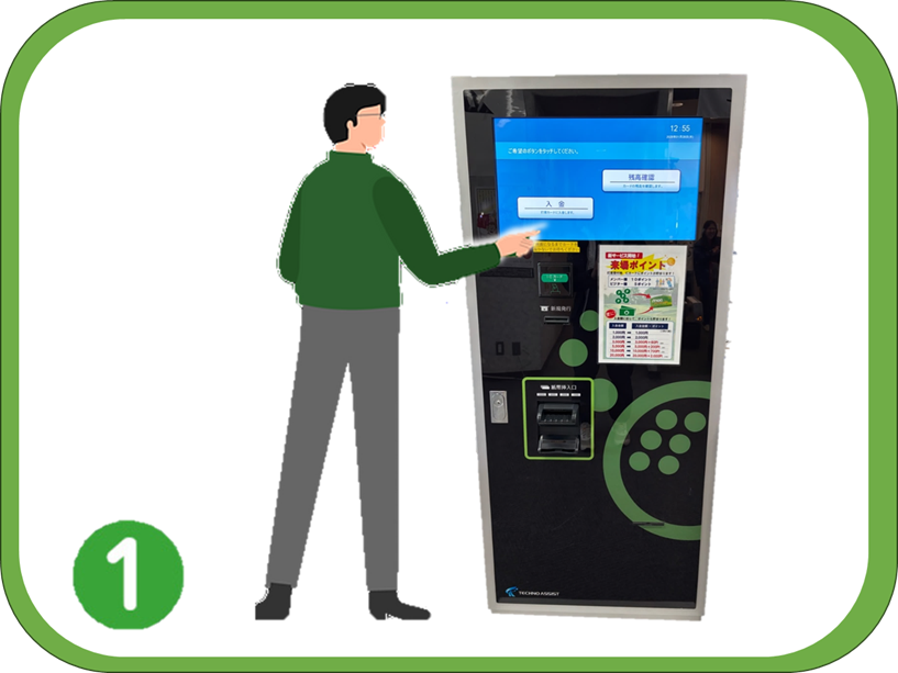 現金の方は1階16番打席後方の貸出機で「現金購入」ボタンをタップして頂き、パネルの表示に従って操作して下さい。